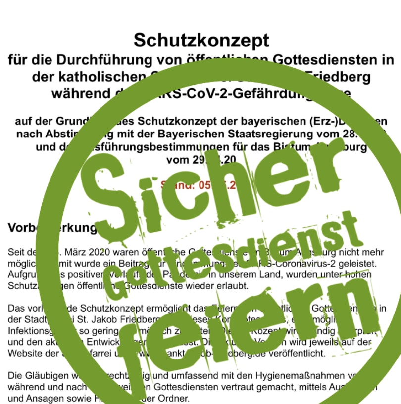 Deshalb haben in einer gemeinsamen Sitzung Pfarrgemeinderat, Kirchenverwaltung, die Kirchenpfleger und der Stadtpfarrer am 4. Mai 2020 ein Schutzkonzept für die Durchführung öffentlicher Gottesdienste in der katholischen Stadtpfarrei St. Jakob während der SARS-CoV-2-Gefährdungslage in Kraft gesetzt.
